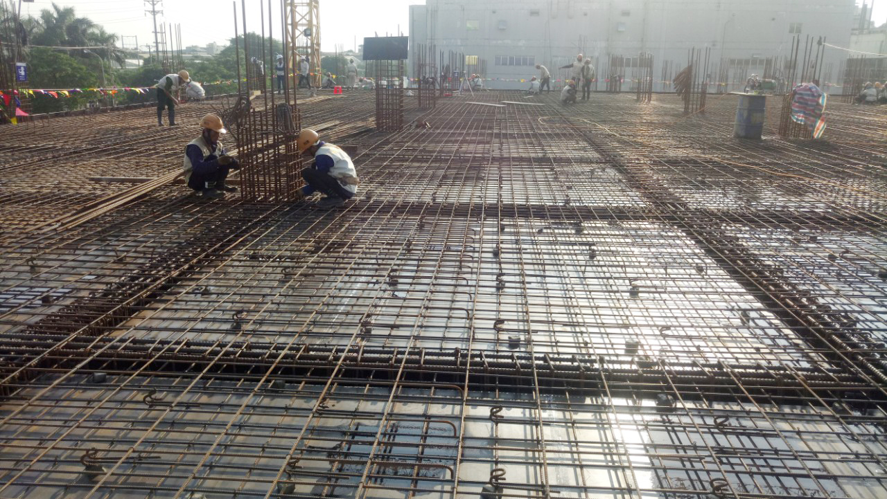 Hiện tại, INVESTCORP đang tiến hành song song thi công phần sàn nền tầng 1 và hệ kết cấu bê tông cốt thép cột, dầm, sàn tầng 2.