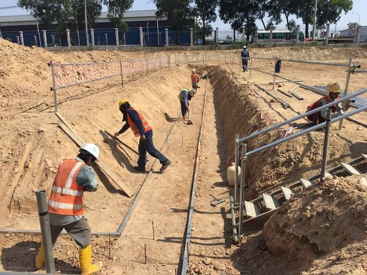 Về các hạng mục ngoài nhà, công tác thi công hệ thống mương thoát nước đang được triển khai đồng loạt. Công tác đào khuôn đường hệ thống đường bê tông nội bộ cũng đang được tiến hành.