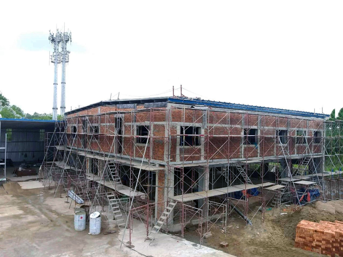 Các hạng mục ngoài nhà như công tác xây trát hàng rào và hệ thống thoát nước đã được triển khai 95% khối lượng. Nhà phụ trợ đã được hoàn thành toàn bộ công tác trát và đang triển khai các công tác hoàn thiện khác.