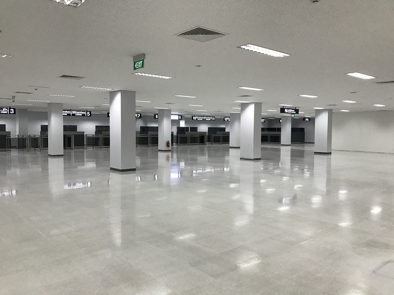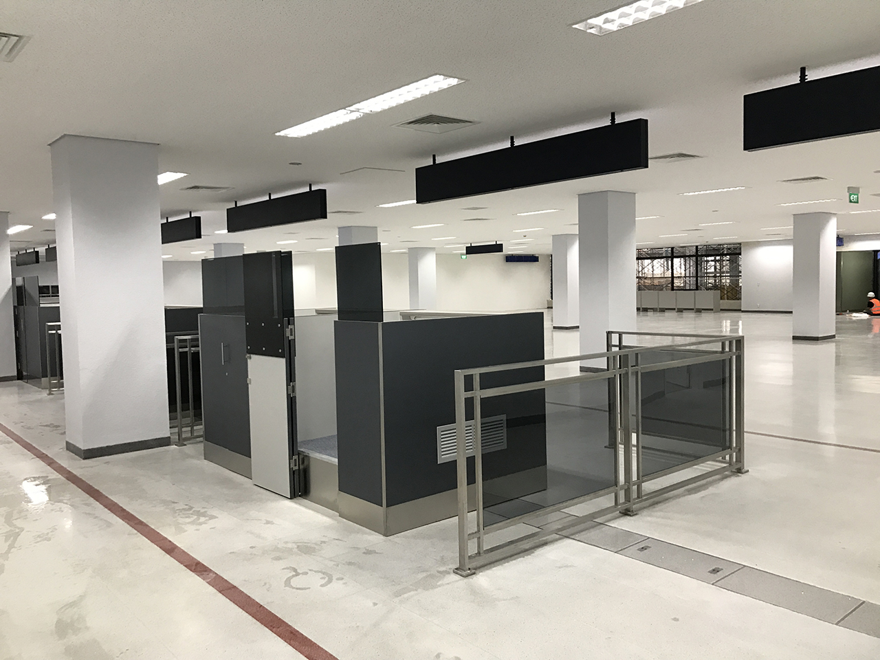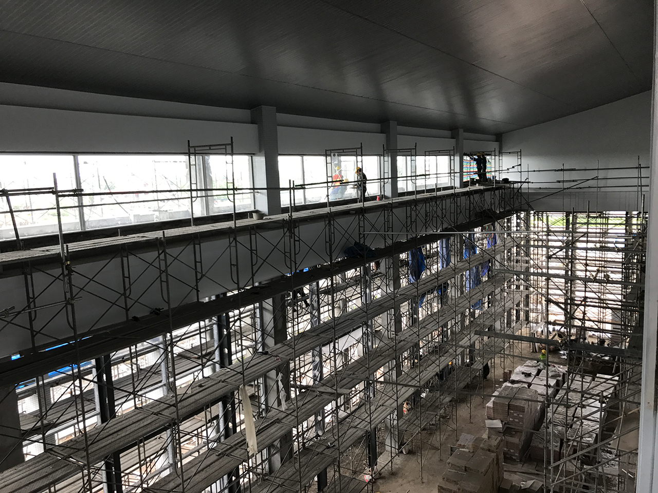 在国际等后室,吊顶石膏板隔墙项目继续展开,在 3 层楼外面铝门框架也施工好,并在2层楼外面安装和施工了玻璃。