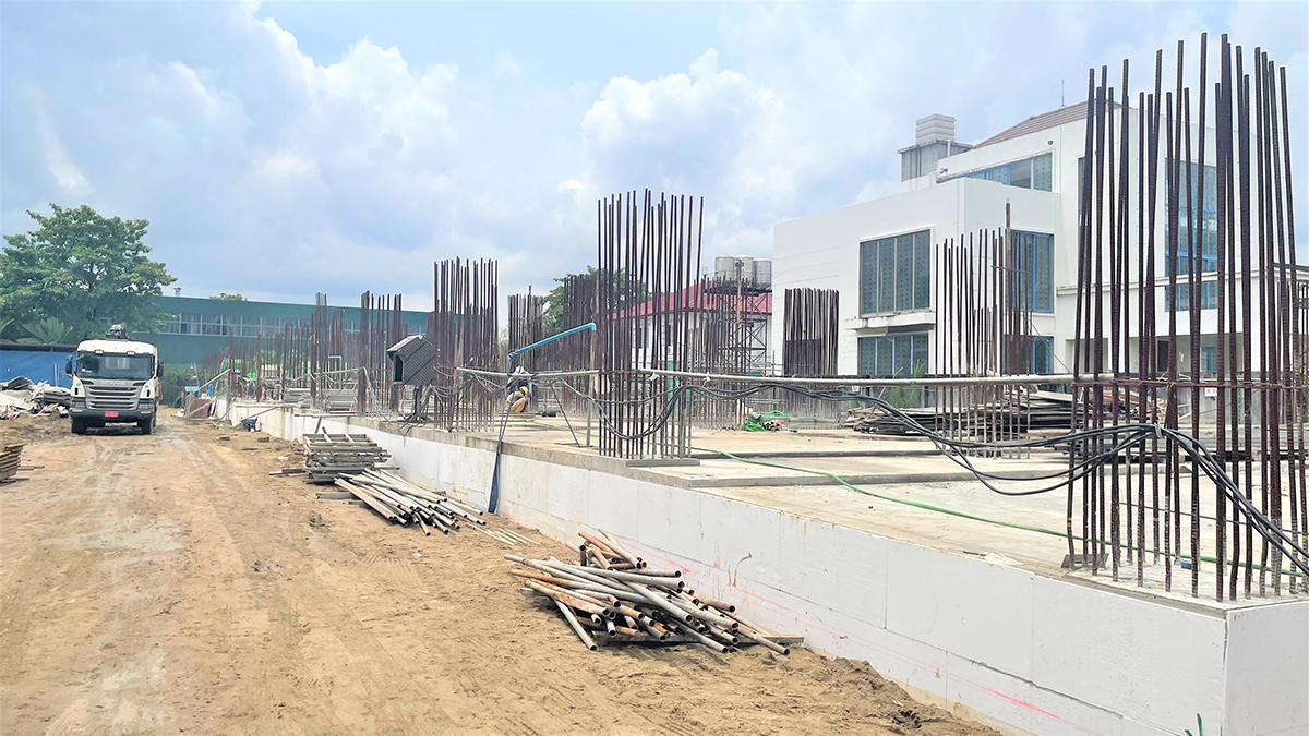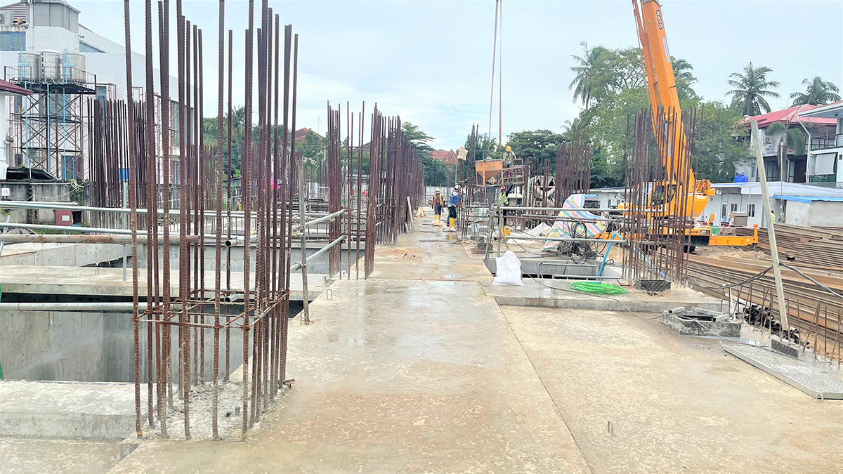 2021 年 8 月,缅甸 INVESTCORP 已完成所有楼板混凝土的施工、钢板桩拔出和 50% 的楼板梁模板拆除工作。 地下室墙外防水和地下室墙外填砂工作也已完成。,混凝土表面的修复和拆除模板后的清洁等其他工作也同时进行。