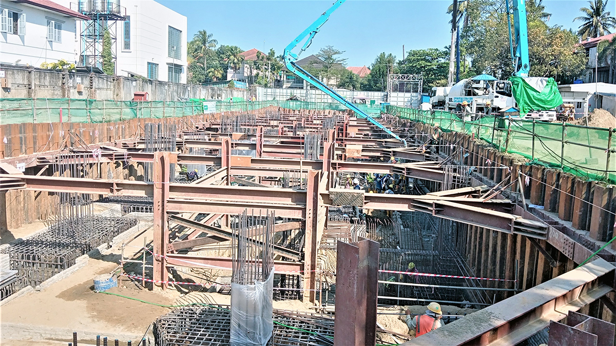 2020 年 12 月,缅甸 INVESTCORP 已完成全部基础承台开挖工作,并正在施工地下屋的各项工作项目。钢筋混泥土结构工作例如地下屋地基承台钢筋混泥土、底部地面与承台组合正在实施中。地下屋地板下的水池璧项目已完成 100% 工作量。模板的加工和架设,地下屋地面钢筋,水池区的地板正在继续加快施工。