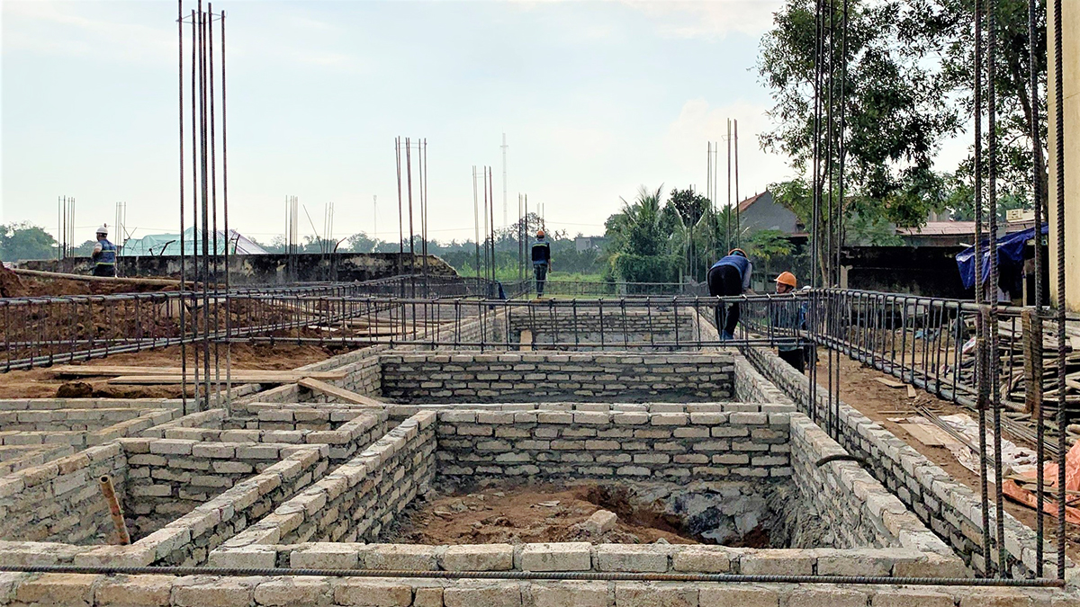 2020 年 11 月初,由于暴雨天气的影响,Tho Xuan 4 高中的多功能房屋项目的石基路堤的建施工工作被暂停了一些天。 目前,INVESTCORP Land Thanh Hoa 已完成包括建造基坑石基础墙、未烧砖基础墙、房子基础土和浇筑混凝土基础的工作。 多功能房屋的模板、钢筋、混凝土柱和墙的施工正在进行中。
