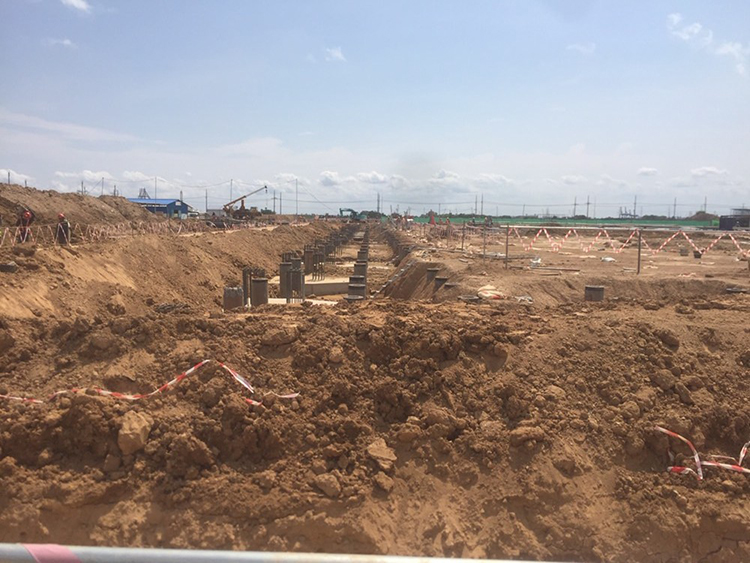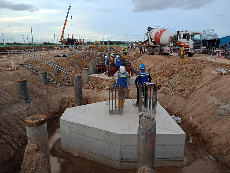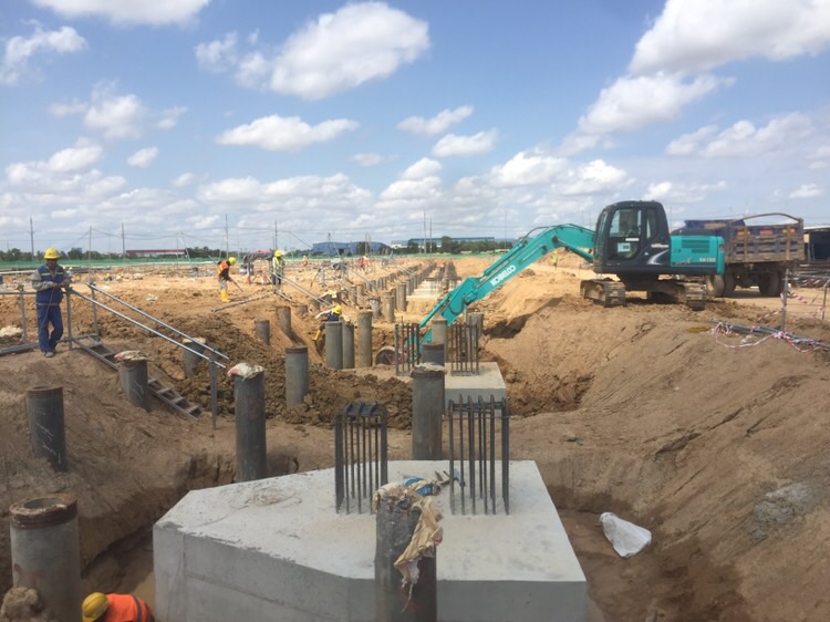经过两个月工程开工之后,各临时项目如临时办公室、仓库场地等已经完成。现在,缅甸 INVESTCORP 公司已完成了厂房基础承台总工作量的 60%,并开始施工地梁、支撑。