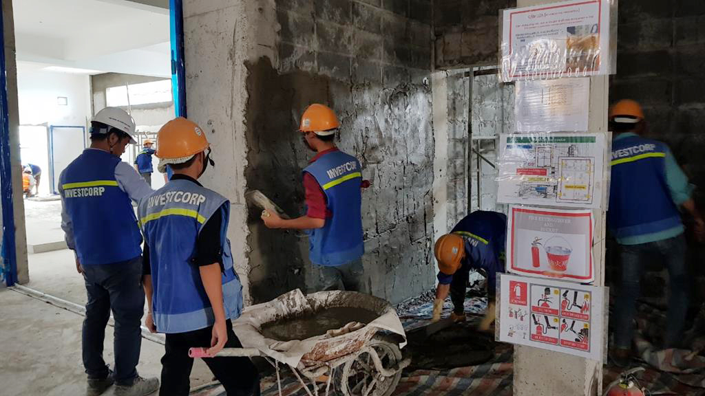 刮腻子、天花板、石膏墙的完善和窗户加工等工作也正在平行进行。INVESTCORP 也结束了雨水排水系统。路边和户外道路工作正在进行中。