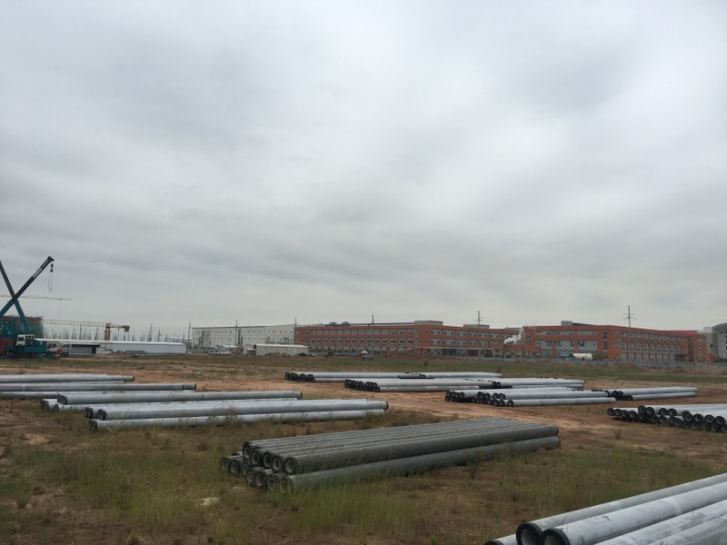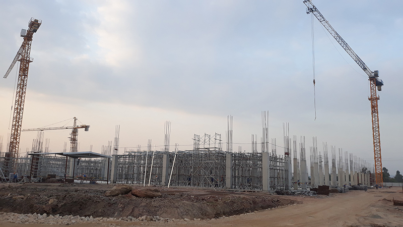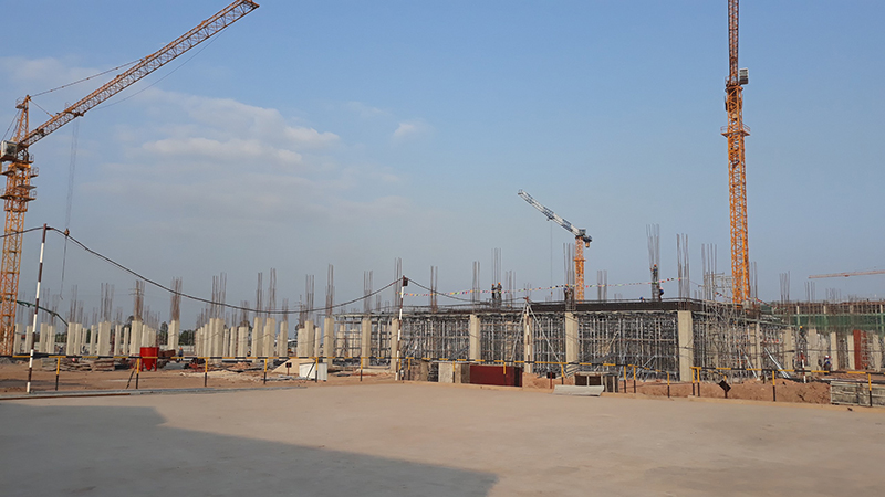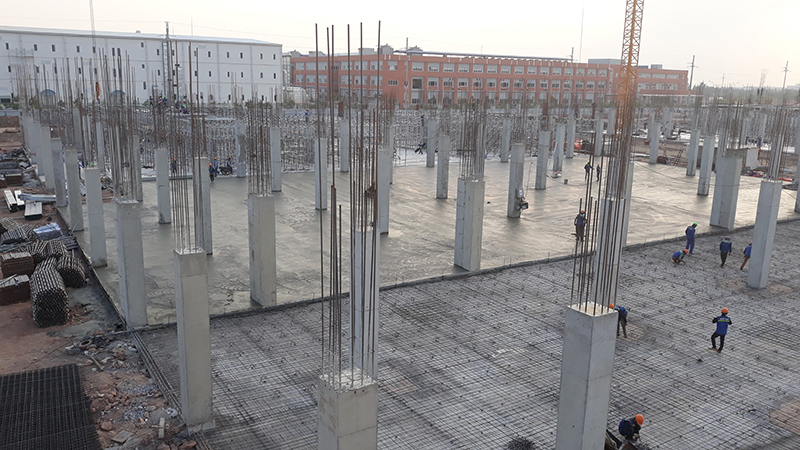 在第一区各项目如打桩、基础承台、给一号和二号厂房和办公室撑梁的工作已经完成,目前混凝土柱子工作和一层地面混凝土已得到承包商完成,以便转到第二层施工地梁,同时以服务于施工项目的组装吊塔工作也平行实行。