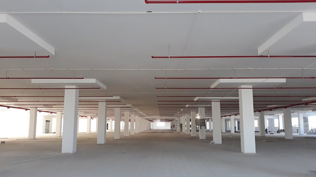 1&2 号厂房区域的室内外墙都完成抹面。室内天花板和墙壁的刮腻子工作已完成 80% 以上。目前,正在进行磨地面工作 以准备进行涂饰环氧涂的平面。此外,INVESTCORP 也正在进行安装窗户、铝合金玻璃幕墙和卫生间的贴砖。户外排水系统、围栏系统也正在急于完成。