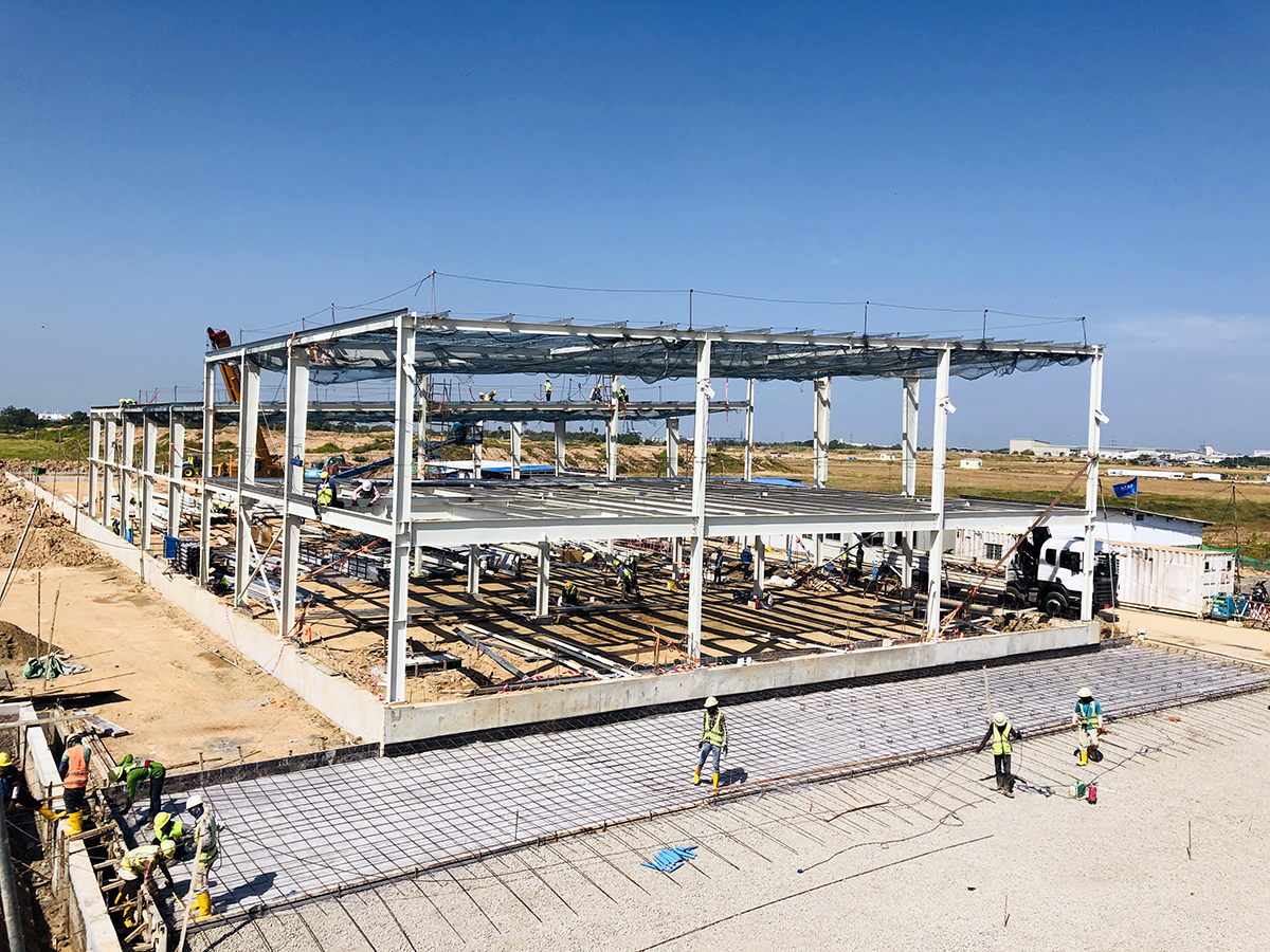 2019 年 10 月底,缅甸 INVESTCORP 公司正在主车间区域内部署和安装主机架结构,建造沙子找平并夯实工厂车间。在办公楼区域,主框架的安装也与模板和加固地板的处理和安装并行进行。